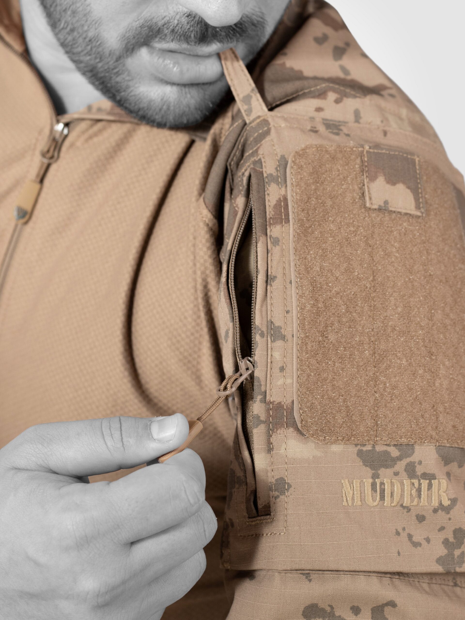 - Kollarda, rütbe, bayrak, birlik arması takılması için tekstil fermuarlı bölgeler,